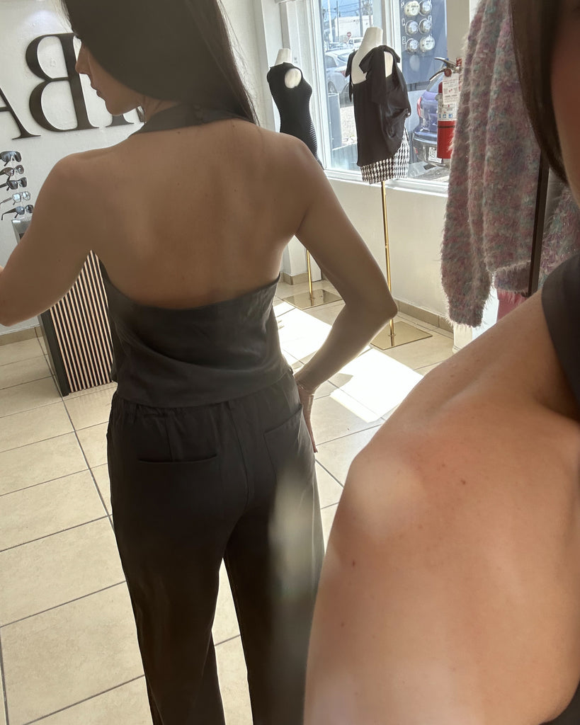 - front tie detail halter suede top with wid-rise wide leg pants